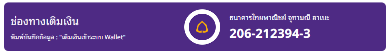 โอนเงินที่ต้องการเติมเงินเข้าระบบไปที่ ธนาคารไทยพาณิชย์ "จุฑามณี อาเบะ" 206-212394-3 เท่านั้น!! (ขั้นต่ำ 1,000 บาท)